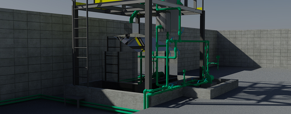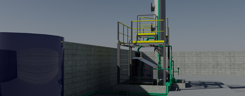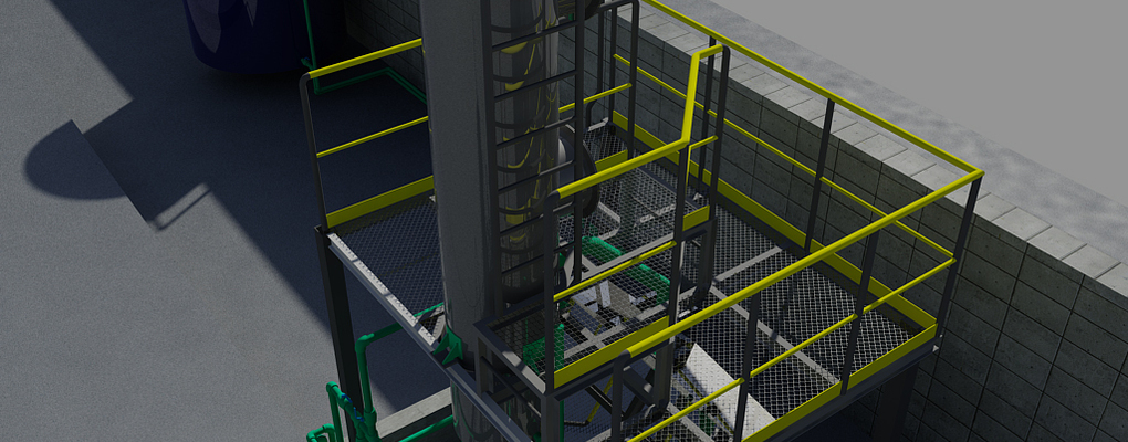 Ingeniería Básica Extendida para sistema de Lavador de Gases diseñado por SIE Consultora. Diseño de cañerías, estructura, barandas, escaleras, lavador vertical, selección de bomba, ejecución de maqueta virtual en 3D, geometrales en 2D, planos de detalles constructivos y diagrama de flujo